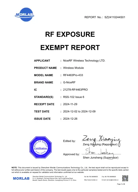 Informe de certificación completo. Haga clic para ver el archivo adjunto detallado de RF4463PRO-433 .