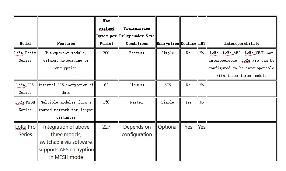 La serie LoRa Pro actualizada es compatible con todas las versiones anteriores de los módulos de transmisión de datos LoRa de nuestra empresa. Los usuarios pueden configurar el módulo en el modo de funcionamiento requerido según las necesidades de su aplicación utilizando el software para PC. Aquí hay una comparación simple entre varias versiones: