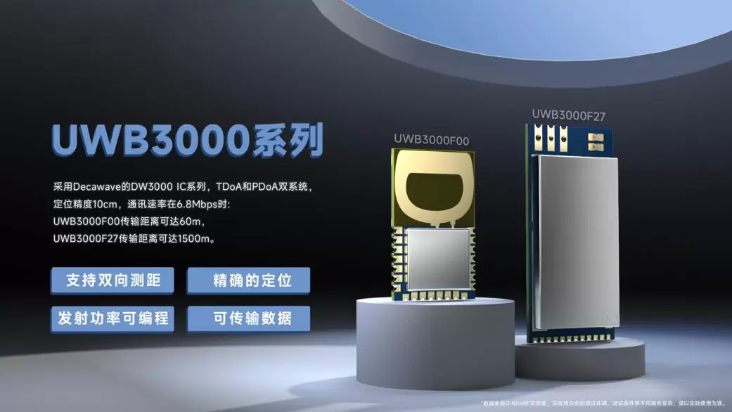 La serie UWB3000 incluye dos modelos: UWB3000F00 y UWB3000F2 7 . Se trata de módulos de posicionamiento UWB rentables y de bajo consumo desarrollados por Sivers Semiconductors utilizando la serie Decawave DW3000 IC. Ofrecen una velocidad de transmisión de datos de hasta 6,8 Mbps, lo que permite sistemas bidireccionales de largo alcance, TDoA y PDoA, con una precisión de posicionamiento de 10 centímetros. Entre ellos, el UWB300F27 es un módulo de alta potencia con 27dBm (500mW) que incorpora un LNA, capaz de lograr comunicación bidireccional, alcance y posicionamiento hasta 1,5 kilómetros (en áreas abiertas).