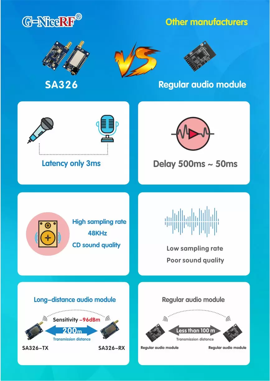Distancia de transmisión en campo abierto: SA316F30-TX puede alcanzar una distancia de transmisión de hasta 1500 metros en entornos de campo abierto, mientras que SA316S-TX está limitado a 200 metros. Esto significa que ya sean actividades al aire libre, salas de conciertos o obras de construcción a gran escala, los módulos SA316 pueden transmitir señales de audio de forma fiable.