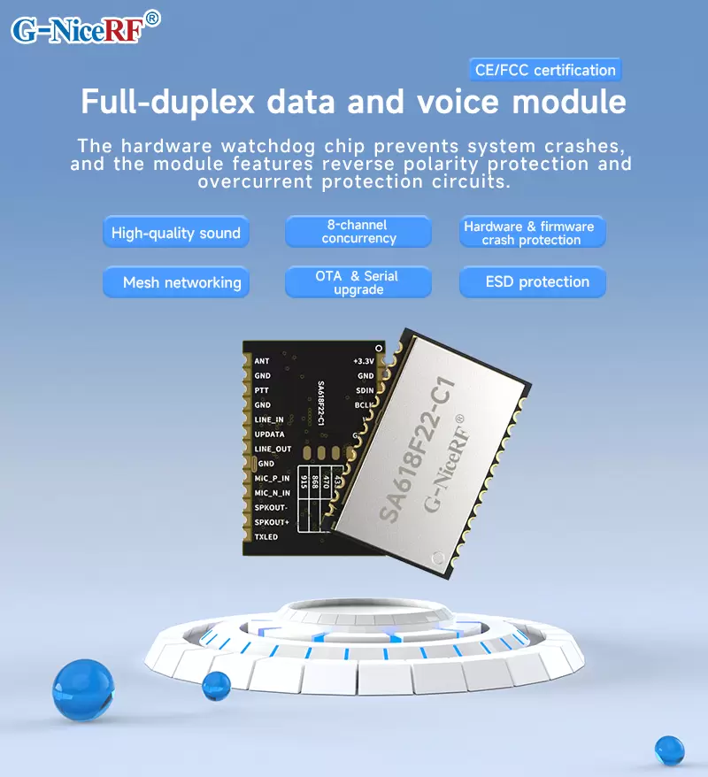 La serie SA6X8-C1 y la serie SA6X8 de NiceRF Wireless son módulos de transmisión full-duplex de audio y digital integrados , disponibles en dos especificaciones de potencia: 160 mW (F22) y 1 W (F30). Ambas series permiten la transmisión inalámbrica de señales de voz a través de interfaces de audio digital o analógico I2S. Comparten varias características, incluidas capacidades de retransmisión inalámbrica de varios niveles, compatibilidad con actualizaciones inalámbricas (OTA) y de puertos serie, protección ESD (descarga electrostática), redes MESH y protección de vigilancia contra fallas del sistema. Este artículo analizará brevemente las características comunes y las ventajas de actualización de estos dos módulos.
